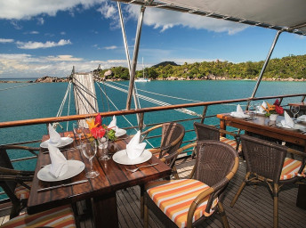 Na vonkajšej palube je taktiež tienená jedálenská časť s výhľadom na more, kde sa odohrávajú obedy formou bohatého bufetu. V priemere dvakrát do týždňa sa koná barbecue priamo na palube alebo na brehu.