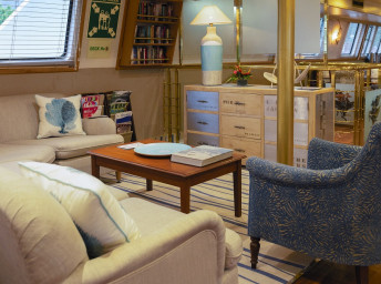 Na hlavnej palube sa nachádza komfortný salón, vybavený pohodlnými kreslami a elegantný bar. Vedľa salónu nájdete knižnicu s výberom kníh v rôznych jazykoch a k dispozícii sú aj rôzne spoločenské hry.