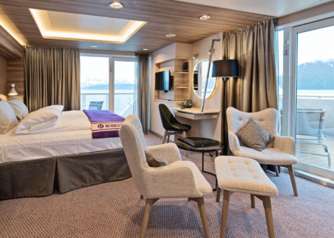 MD - Expedition Large Suite s balkónom ♿ 35 m². Balkón. TV, minibar, varná kanvica, kávovar. Bezbariérová kajuta♿ 7. paluba vpredu. Max 4 osoby. Výhody Suite. 21 520 € 10 760 € za osobu