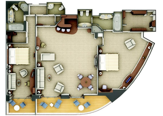| R2 - Royal Suite 2 105-110 m² + balkón 16-17 m². Royal Suite R1 spojená s Veranda Suite. 6,7. paluba vpredu. Max 5 osôb. | 60 600 € 20 200 € za osobu |