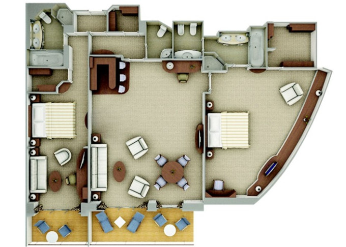 | O2 - Owner's Suite 2 107 m² + 20 m² balkóny. Owners Suite O1 spojená s Vista Suite. 7. paluba stred. Max 5 osôb. | 49 800 € 24 900 € za osobu |