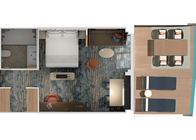 HU - Suite Havana Cabana Corner 33 m² + vonkajšie rohové patio 15 m². 8. paluba vpredu. Max 3 osoby. Tropický štýl, vstup do exkluzívnej zóny Havana. Výhody Suite. 4 776 € 2 388 € za osobu