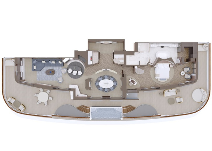 | Ocean Deluxe Penthouse Suita 9,10. paluba: 38 m² / 6,7. paluba: 43 m² + Terasa so sedením a pohovkou alebo kreslami 6,9,10. paluba: 10 m² / 7. paluba: 18 m². Spálňa s obývacou a jedálenskou časťou, šatník. Minibar, kávovar, vodná kanvica, ďalekohľad, sejf, kúpeľňa so sprchou. Taška Technogym Case Kit. Fľaša šampanského na privítanie. Maximálna kapacita 3 osoby. | 25 160 € 25 160 € za osobu | ||