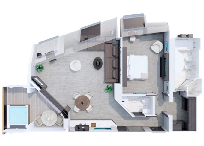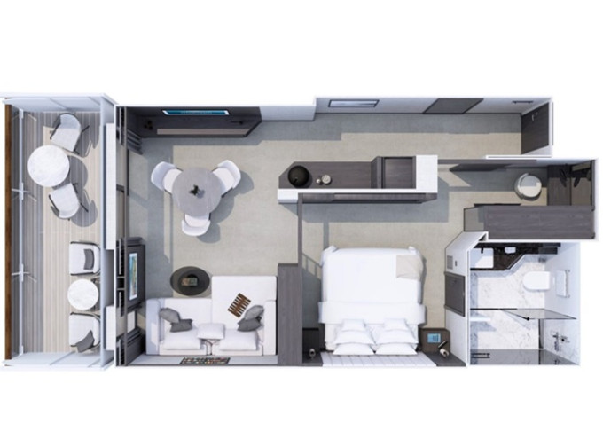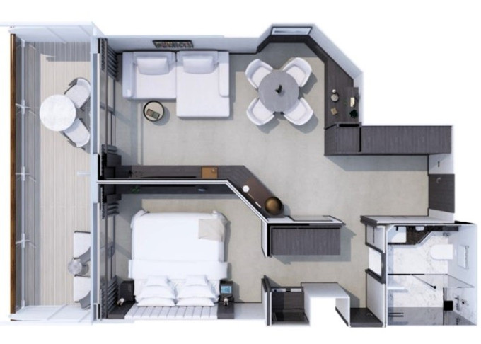 | Ocean Residence - Cove Residence Suita 56 m² + Terasa s vírivkou, sedením a pohovkou alebo lehátkami 14 m² / 6. paluba: 24 m². Spálňa s obývacou a jedálenskou časťou, šatník. Koktailová súprava, minibar, kávovar, vodná kanvica, ďalekohľad, sejf, kúpeľňa so sprchou. Závesy, svetlo, klimatizácia ovládané smart technológiou. Taška Technogym Case Kit. Fľaša šampanského na privítanie. Maximálna kapacita 3 osoby. | 41 300 € 20 650 € za osobu |