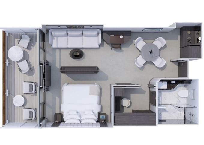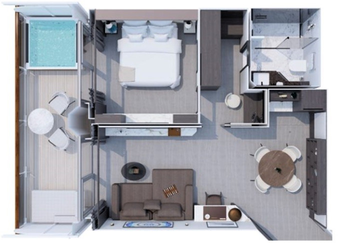 | Ocean Residence - Cove Residence Suita 56 m² + Terasa s vírivkou, sedením a pohovkou alebo lehátkami 14 m² / 6. paluba: 24 m². Spálňa s obývacou a jedálenskou časťou, šatník. Koktailová súprava, minibar, kávovar, vodná kanvica, ďalekohľad, sejf, kúpeľňa so sprchou. Závesy, svetlo, klimatizácia ovládané smart technológiou. Taška Technogym Case Kit. Fľaša šampanského na privítanie. Maximálna kapacita 3 osoby. | 41 300 € 41 300 € za osobu |