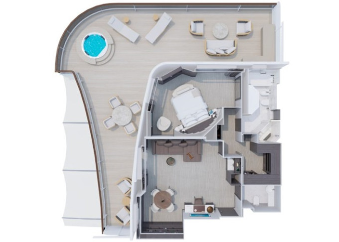 | Ocean Residence - Cove Residence Suita 56 m² + Terasa s vírivkou, sedením a pohovkou alebo lehátkami 14 m² / 6. paluba: 24 m². Spálňa s obývacou a jedálenskou časťou, šatník. Koktailová súprava, minibar, kávovar, vodná kanvica, ďalekohľad, sejf, kúpeľňa so sprchou. Závesy, svetlo, klimatizácia ovládané smart technológiou. Taška Technogym Case Kit. Fľaša šampanského na privítanie. Maximálna kapacita 3 osoby. | 72 272 € 18 068 € za osobu |