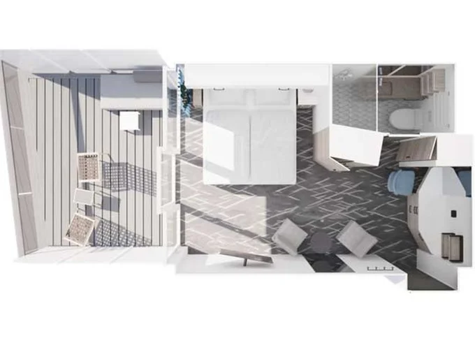 | VKKO - Kajuta s terasou 20 m² + balkón 13 m² so stoličkami a váľandou. 15. paluba. Max 2 osoby. | 3 592 € 3 592 € za osobu | ||