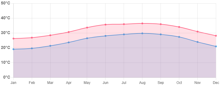 Táto oblasť má jedno z najteplejších podnebí na zemi s priemernou teplotou okolo 30°C . V letných mesiacoch sa denné teploty pohybují okolo 37°C  a v noci 31°C.  V zime je denná teplota okolo 30°C a v noci poklesne na 20°C.